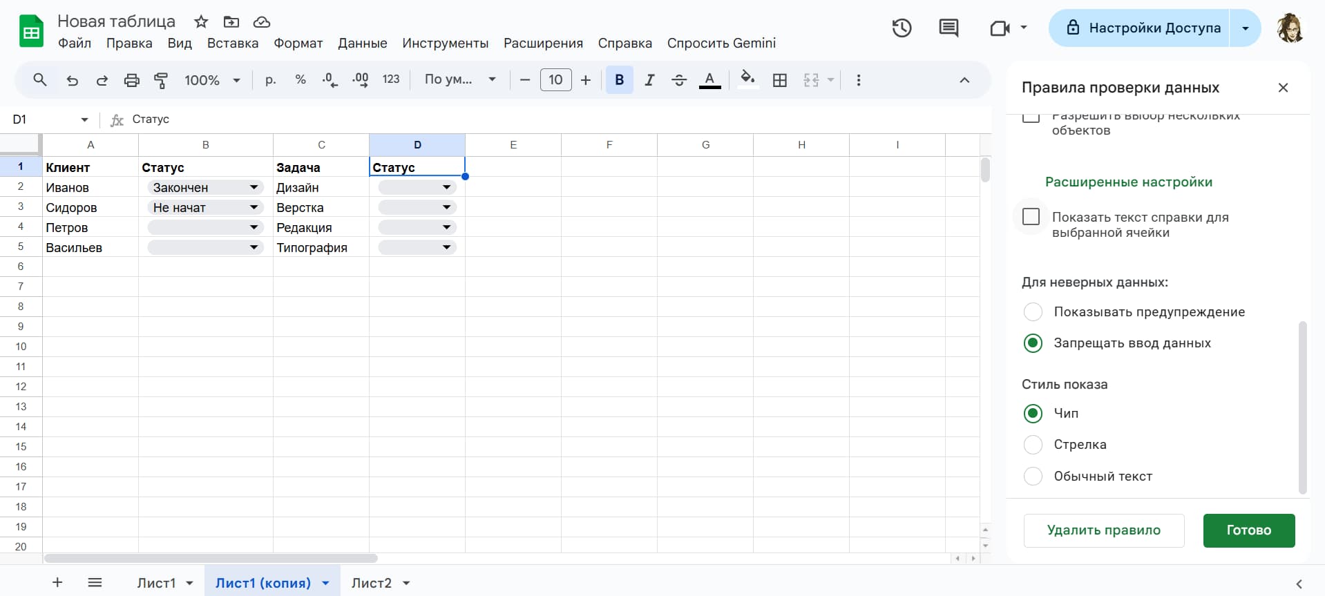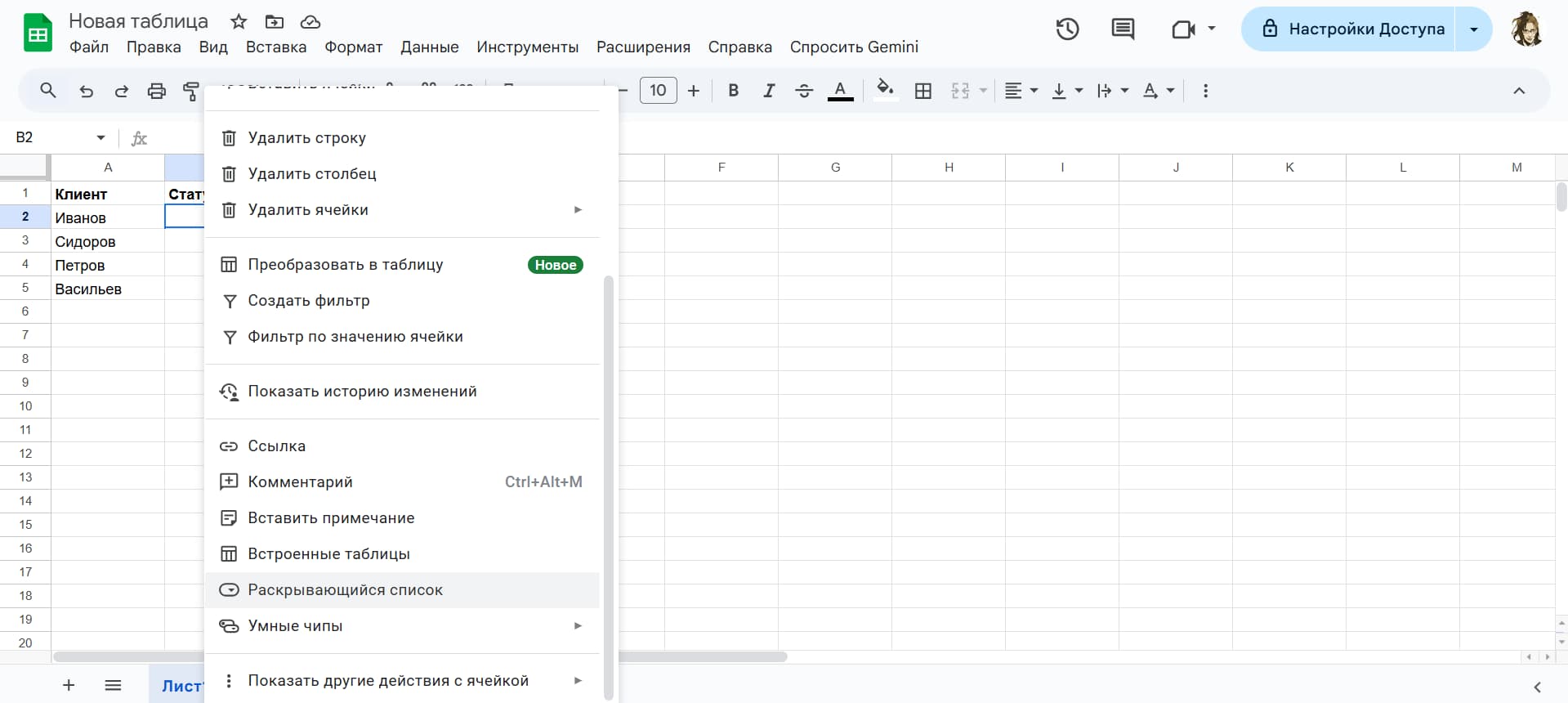 Раскрывающийся список — это инструмент в Google Таблицах, благодаря которому вы можете выбрать значение для ячейки из заранее определенного вами перечня. Это не просто удобный вариант ввода данных, а полезный механизм для стандартизации информации, минимизации погрешностей и ускорения работы с таблицей. Ниже мы подробно разберем, как делать, применять, изменять и удалять выпадающие списки. Эта тема важна для всех, кто работает с большим количеством данных, так как использование в своей деятельности выпадающих списков влияет на скорость, точность и эффективность работы.