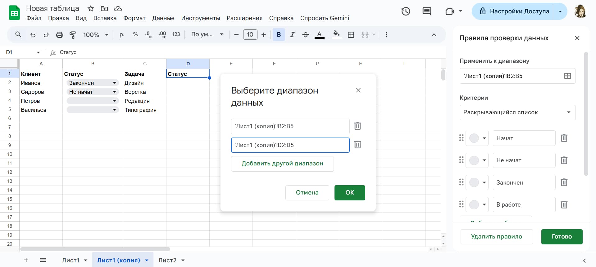 В таком случае лучше всего при создании применить настройку «Список из диапазона». Разместите ваш список на отдельном листе и укажите этот диапазон в качестве источника. Чтобы не обновлять правило каждый раз, выделите для списка целую колонку (например, A:A).