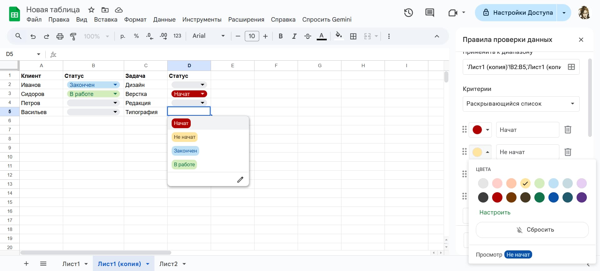 Функция цветового оформления пунктов в выпадающем списке доступна только при использовании способа «Список» (ручной ввод). Если вы используете «Список из диапазона», изменить цвет отдельных пунктов напрямую в настройках списка нельзя. В этом случае можно использовать условное форматирование для ячеек, основываясь на их значении.