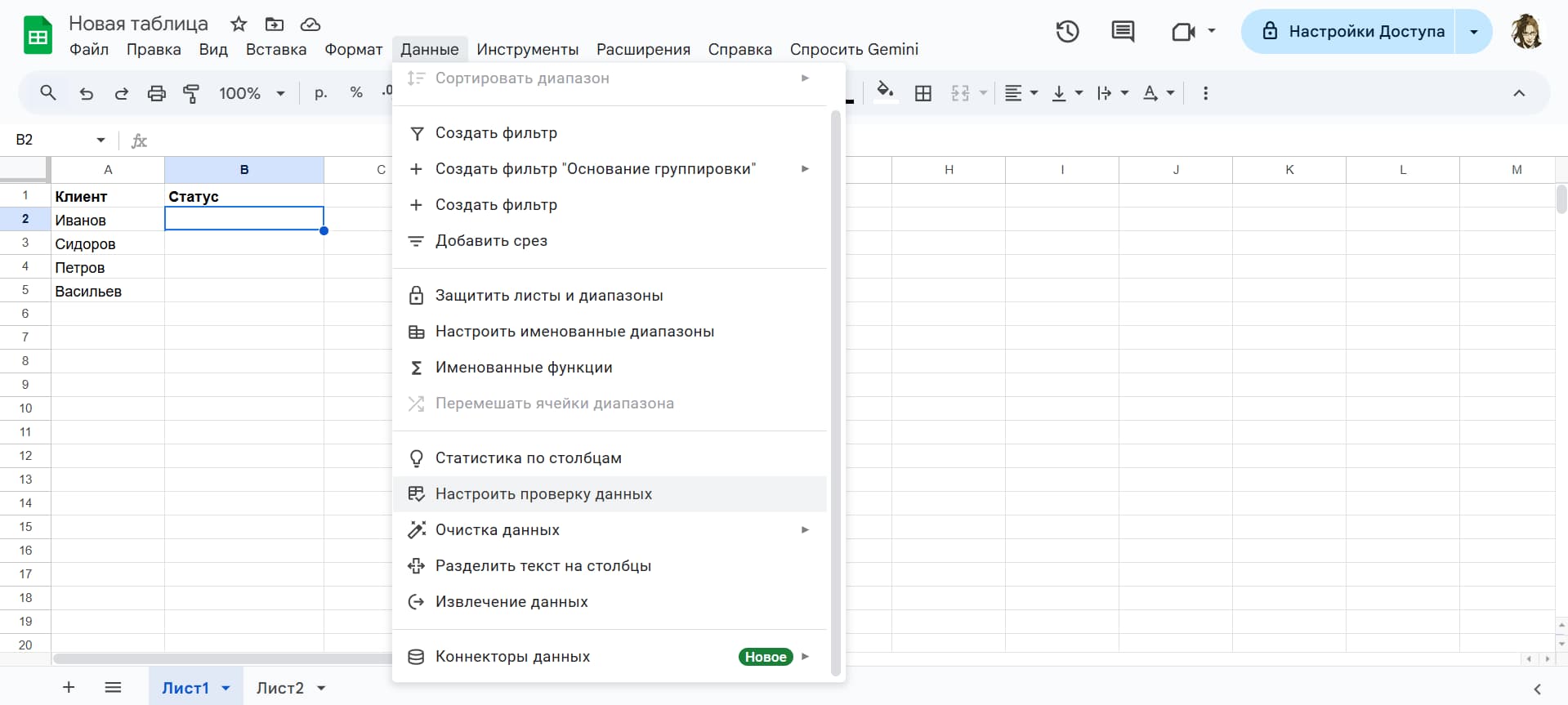 - В верхней строчке выберете «Данные», а после «Настроить проверку данных». В боковом меню появится пункт «Добавить правило» и у вас откроется меню настройки выпадающего списка.