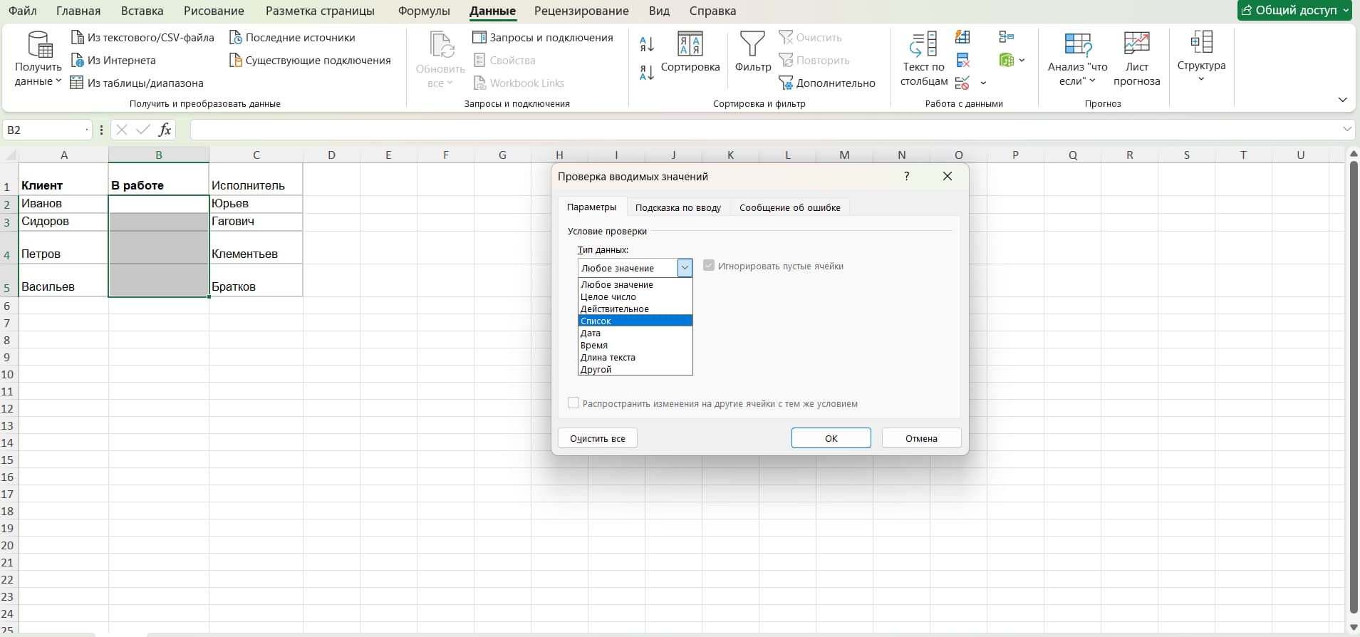 - В открывшемся окне, во вкладке «Параметры», в поле «Тип данных» выберите «Список».