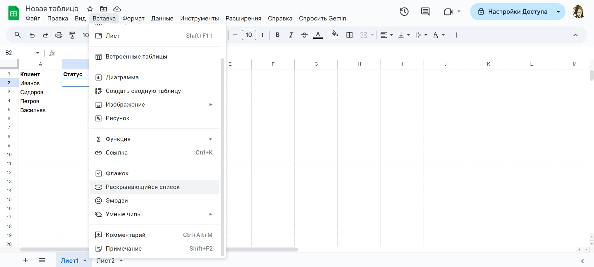 - В меню сверху выберите «Вставка» и пункт «Раскрывающийся список».