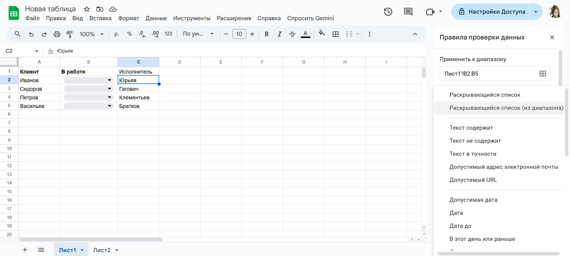 - Теперь вам необходимо выбрать диапазон данных, из которых будет создан выпадающий список. В нашем случае это колонка «Исполнители» в диапазоне С2:С5.